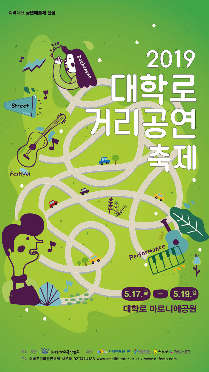 공연별 일정은 2019 대학로 거리공연 축제(https://www.d-festa.com)에서 확인 가능하며, 문의는 대학로 거리공연 축제 사무국(☎ 02-741-4188)으로 연락하면 안내받을 수 있다.