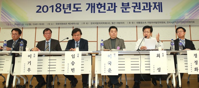 이날 토론회에 임승빈 한국지방자치학회장이 사회를 맡고, 최성 고양시장(전국대도시시장협의회장), 이기우 인하대 법학전문대학원 교수, 김송원 인천 경실련 사무총장, 이창용 지방분권개헌운동 실행위원장, 정정화 강원대 행정학과 교수가 토론자로 참석했다.