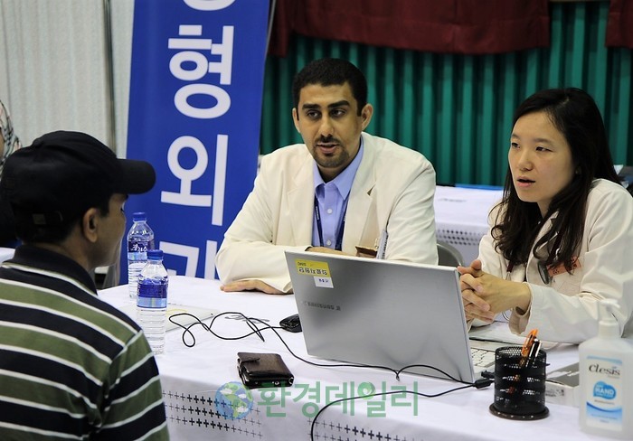 | ▲삼성서울병원 의료진과 수련중인 사우디 수련의가 난민 의료봉사에 참여해 환자를 진료하고 있다. |