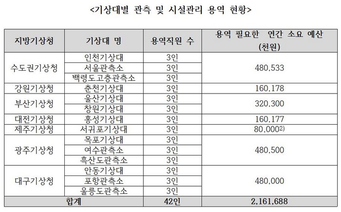 이 과정에서 기상청은 별도로 민간 회사와 연간 총 21억원의 인력 용역계약을 맺고 '기상관측 및 시설관리 업무'를 맡도록 해, 기상청이 제도도입 3년만에 무인화 전환사업 실패를 사실상 시인한 것이라는 지적이 나온다.