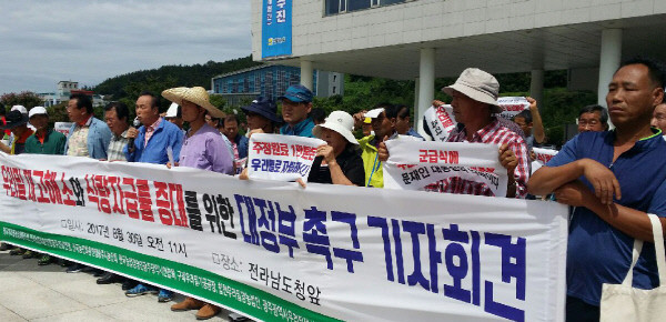 | ▲지난해 7월 전국 우리밀 생산 농민들이 전남도청 앞에서 집회를 열고 창고에 쌓여있는 우리밀 소비대책을 세워 달라고 정부에 호소했다. |