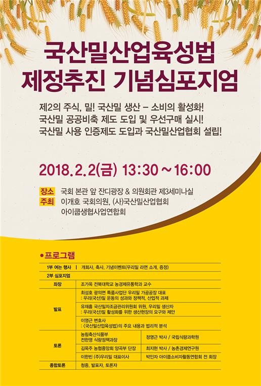 심포지엄에 앞서 국회 본관 앞에서 국산밀산업육성법 제정 추진 기념식이 실시되고, 곧바로 자리를 옮겨 오후 2시부터 의원회관 제3세미나실에서 심포지엄이 실시된다.