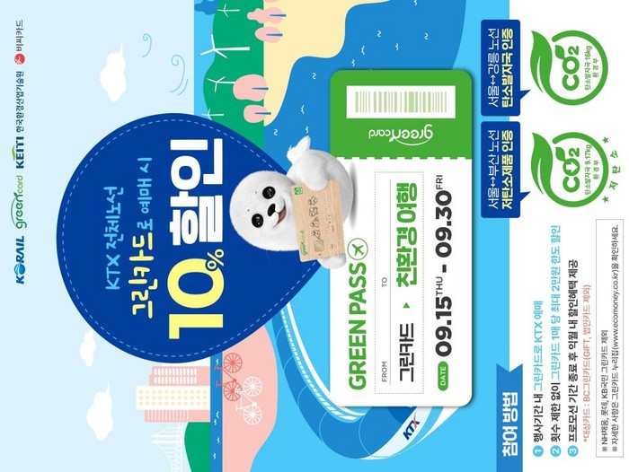KEITI 한국환경산업기술원과 BC카드(대표 최원석), 코레일(KORAIL) 한국철도공사(사장 나희승)와 함께 가을철 여행을 떠날 때 개인차량 이동을 최소화하고, 저탄소 이동수단 이용 장려를 목적으로 KTX 할인 혜택을 제공하는 그린카드 특별행사를 진행한다.