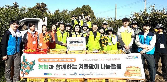 [환경데일리 장수익 제주취재본부 기자]농협중앙회 지역사회공헌부와 제주본부는 8일 '국민과 함께하는 농촌봉사활동' 5개 참여 단체와 함께 제주 조천읍 감귤농가에서 '겨울맞이 나눔활동'을 실시했다고 밝혔다.