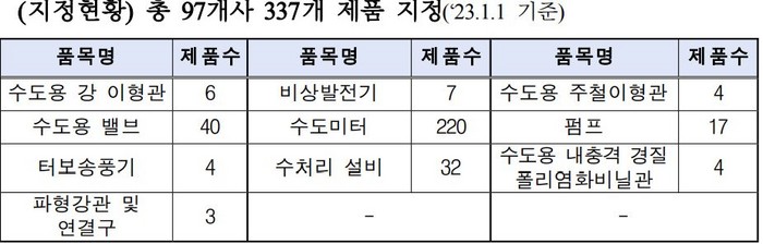 올 1월 말 기준 97개사 337개 제품이 지정된 품목은 수도용 강이형관(6개), 비상발전기(7개), 수도용 주철이형관(4개), 수도미터(220개), 펌프(17개), 터보송풍기(4개), 수처리 설비(32개), 수도용 내충격 경질 폴리염화비닐관(4개), 파형강관 및 연결구(3개), 수도용 밸브(40개)에 달한다.