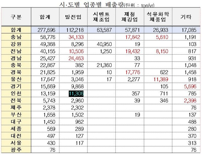 업종별 배출량은 발전업 11만 2218톤(40%), 시멘트제조업 6만 3587톤(23%), 제철제강업 5만 7871톤(21%), 석유화학제품업 2만 6933톤(10%) 순으로 나타났다. 전년(2018년) 대비 저감량으로 보면 발전업 △3만3249톤, 석유화학제품업 △8367톤, 제철제강업 △5512톤 시멘트 제조업 △3517톤 순으로 오염물질이 많이 줄었다.