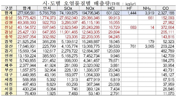 이같은 수치는 2015년부터 19년까지 5년간 총 배출량으로 충남도 5만 8775톤(21%)을 뿜내내 여전히 많은 비중을 차지하는 것으로 나타났다. 이어서 강원도 4만 9368톤(18%), 다음으로는 전남도 4만 155톤(14%), 경남도 2만 5427톤(9%), 충청북도 2만 2867톤(8%) 등으로 집계됐다.