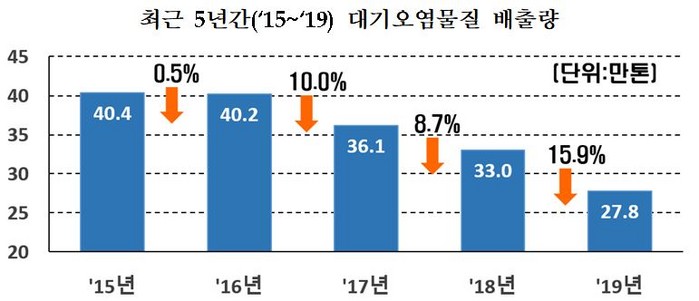 2019년 먼지, 황산화물, 질소산화물의 대기오염물질 배출량은 2015년 40만 892톤보다 31% 감소한 것으로 분석됐다.