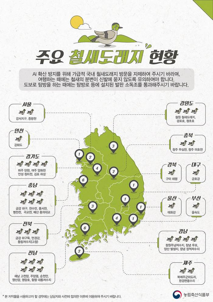 올겨울(2017년 11월 이후) '야생조류 인플루엔자(AI)' 바이러스가 남부 지역에서 먼저 검출되는 등 예년(2016년)과 다른 것으로 나타났다.
