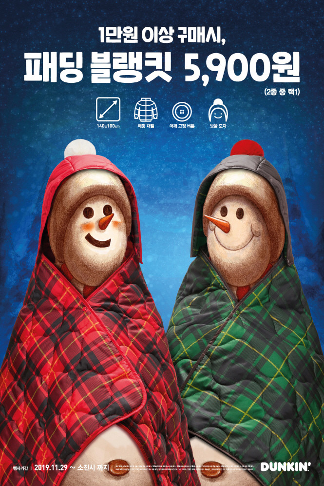 던킨도너츠는 29일부터 던킨도너츠 제품을 1만 원 이상 구매하는 고객에게 '패딩 블랭킷'을 5900원에 제공한다. 이번 행사는 프로모션 상품 소진 시까지 진행되며 블랭킷 별도 구매는 불가하다. 타 행사, 제휴 할인, 타 쿠폰 중복 적용은 불가하다. (일부 매장 제외, 자세한 내용은 홈페이지 참고)
