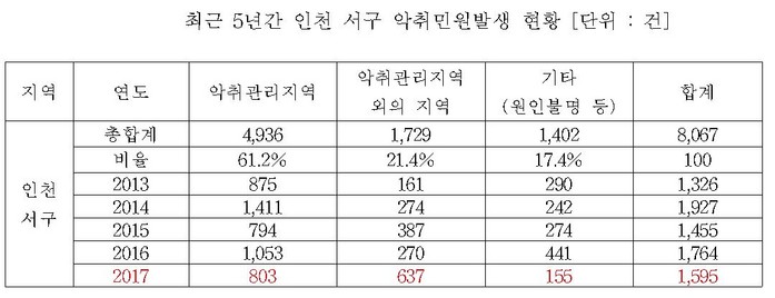 최근 5년간 악취민원발생 건수는 총 6만5233건으로 인천 서구는 8067건(12.4%)이 발생했다. 인천서구 악취민원은 악취관리지역 4936건(61.2%), 악취관리지역외의지역 1729건(21.4%), 기타(원인불명) 1402건(17.4%)으로 나타났다.