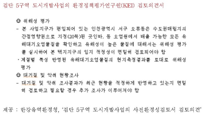 녹색연합과 이정미 의원은 인천 서구에서 진행된 인천 서구 택지개발지역 11곳을 분석을 통해 KEI 검토의견 5곳 중에 2곳이 '입지 부적절'이라는 것을 확인했다.