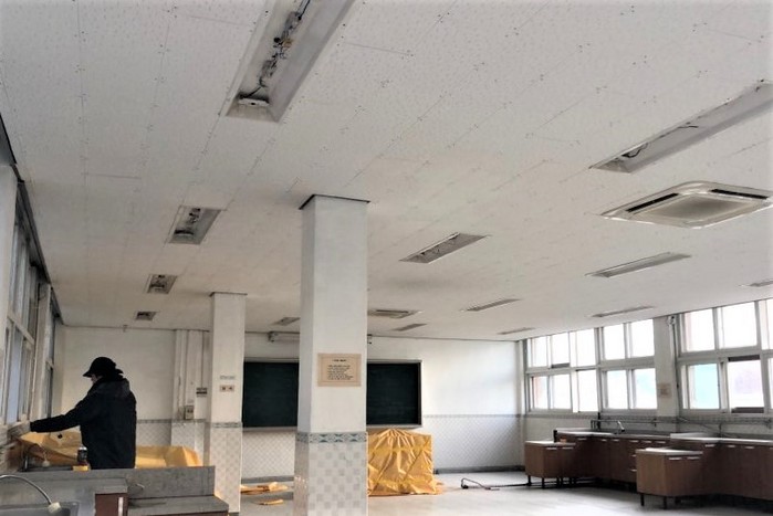 ▲작업자가 학교 내 가구 등 집기를 비닐보양하고 있는 모습, 이 역시 공사후 비닐을 제거할 때 석면가루는 외부 로 빠져 나간다. |
