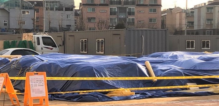 ▲인천시 서구 한 고등학교는 지난해 겨울방학 동안 학교 석면 해체철거 작업을 했다. 석면 함유 텍스를 운동장에 보관해 공사 막바지에 지정폐기물로 배출된다. |