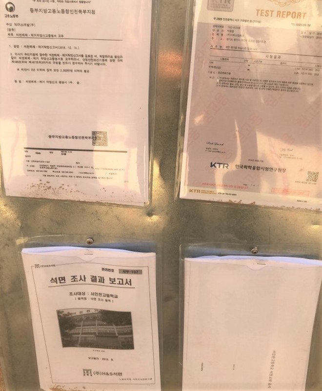 ▲학교는 물론 일반 건물, 지하철 등 시설개선작업을 목적으로 석면해체철거 공사에 석면분포, 석면함유량 등을 일반인들이 쉽게 볼 수 있도록 공개하고 있다. 하지만 이 역시 투명성을 떨어진다. |