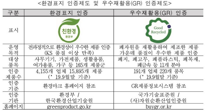 아울러 GR인증제도는 산업기술혁신촉진법 제15조 및 자원의 절약과 재활용 촉진에 관한 법률 제33조에 따라 재활용제품의 수요 기반을 확충하고 기술개발을 촉진하기 위해 자원절약 및 환경친화성 등의 재활용 파급효과가 인증되고, 성능‧품질이 우수한 재활용 제품에 대해 우수재활용제품(GR)인증을 부여하고 있다.