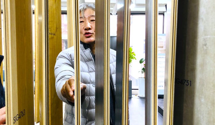 ▲권혁태 대표이사는 수십여 종이 벨기에산 세계적인 명품 바닥 마루재는 우리나라 소비자들에게 매우 긍정적인 반응을 주는 만족 도를 끌어줬다고 본사 전시장에서 제품 성명을 하고 있다. |
