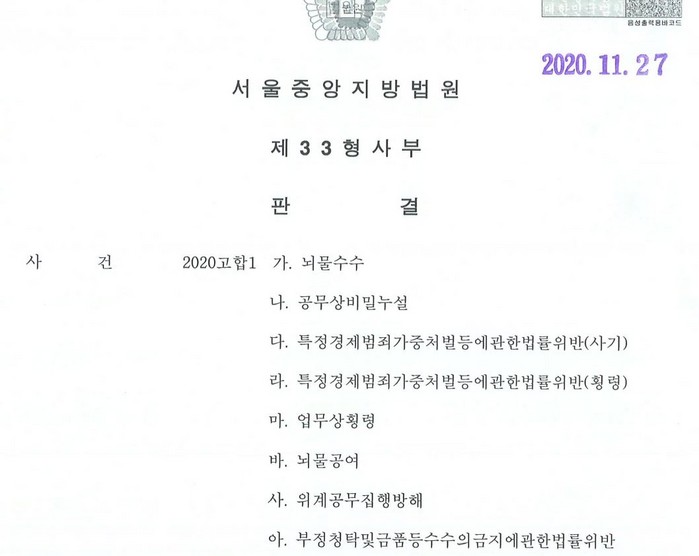 서울중앙지법은 정씨는 징역 3년을, 이 전 고등군사법원장은 징역 4년을, 최 전 서장은 징역 1년을, 이 전 계장은 징역 6월에 집행유예 1년형을 선고받았다.