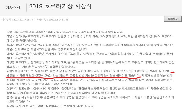 [환경데일리 김영민 기자/ 추진호 탐사보도 기자]2019년 12월 서울 정동 한 종교단체에서 올해의 공익제보자에 대한 시상식에 열렸다. 호루라기재단에서 주최한 공익제보자에 대한 시상과 격려의 행사가 진행됐다. 이 자리에는 문제의 인물은 군납비리를 비롯해, 이마트 로비, 횡령 등에 중심적인 역할을 한 공익제보자로 장 모씨(현재 수감중)가 공직제보상을 받았다.