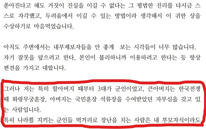 | ▲공익제보상을 받은 장 모씨는 수상소감에서 없는 거짓말까지 서슴치 않으면 공익제보 정신을 기만하고 관련이들에게 상처까지 줬다.본지가 취재한 결과, 장 씨는 큰아버지는 전혀 확인된 바 없고 아버지는 훈장은 제대하고 나이들어 닭집하면서 장애인 고용한 걸로 군인회에서 받은 훈장인 것으로 전해졌다. 그리고 장 씨는 본인이 ROTC라고 거짓말하고 다녔는데 학사장교 출신 대위로 전역했다. 사람들에게 자기가 소령으로 전역했다고 하고 자기 친척이 장세동이라고도 거짓말 했다 |