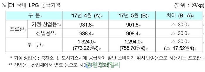 E1은 국제 LPG가격 및 환율 등을 종합적으로 고려, 5월 국내 LPG 공급가격을 프로판과 부탄 모두 각각 30원/kg 인하한다.