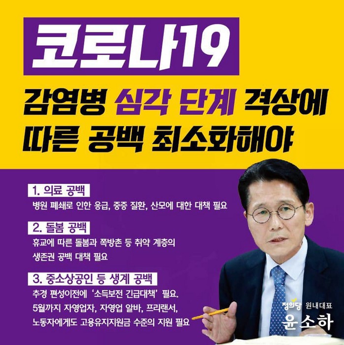 윤소하 의원은 3개월간 한시적으로 직접 재정지출을 통한 '소득보전 비상대책' 수립을 적극 제안했다. 기업에 지원하는 고용유지 지원금 수준으로, 개인 자영업자, 자영업 알바, 프리랜서 노동자에게도 지원과 더불어 정부와 대통령은 헌법이 보장한 모든 권한을 사용해 코로나 19로 인한 서민들의 생존권을 지켜야 할 것이다고 말했다.