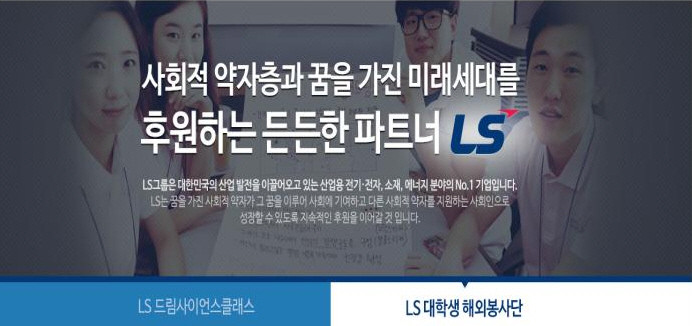 네이버 해피빈과 함께 LS그룹은 지난 9년 간 개발도상국 아이들의 미래와 희망을 위해 LS 대학생 해외봉사단을 파견해 교육 환경 개선을 위해 활동해오고 있다.