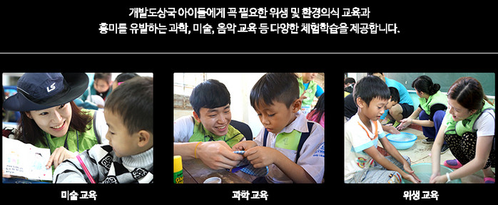 우리나라는 빠른 성장을 통해 생활, 문화, 교육 등 아이들을 위한 좋은 환경을 갖추고 있다. 하지만 지구 곳곳엔 열악한 환경에서 생활하며 미래를 위한 꿈을 키울 기회조차 얻지 못하는 사람들이 많이 있다.