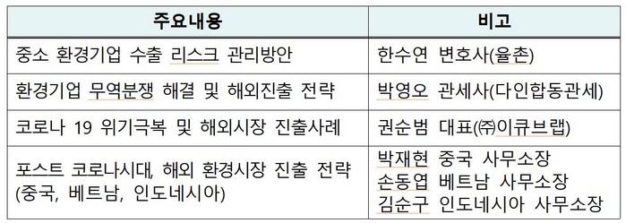 이번 포럼 은 코로나19로 국내 환경기업이 당면할 수 있는 법률, 무역분야 리스크 관리 방안 및 우수 환경기업의 성공사례를 공유하고, 포스트 코로나 시대에 중국, 베트남, 인도네시아 유망 환경시장 진출 전략을 제시한다.