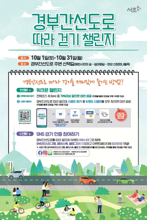 서울 서초구는 가을날, '경부간선도로 주변 산책길'을 따라 걸으며 건강도, 선물도 함께 챙기는 풍성한 이벤트를 한달 간 진행한다.