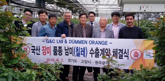 고양시 농업기술센터는 지난 2일 2018고양국제꽃박람회에 초청된 칠레와 경기도농업기술원 장미품종 해외 공급업체 두먼오렌지사가 딥퍼플, 딥실버, 쇼걸 장미 3품종의 수출 계약을 체결했다고 밝혔다.