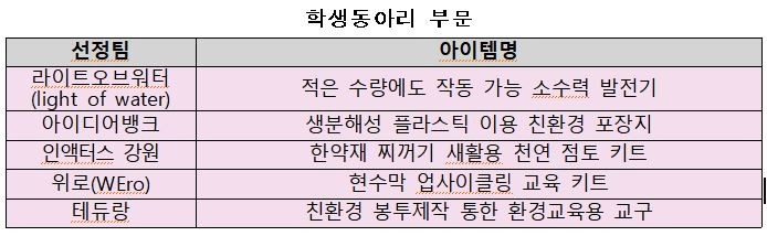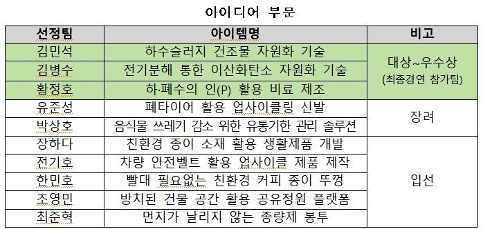 아이디어 부문에서 1위를 차지한 김민석팀은 하수슬러지 건조물의 자원화 기술로 호평을 받았고 3000만 원의 상금과 환경부 장관상을. 나머지 ㈜한내포티팀, ㈜엘에이알팀과 김병수팀, 황정호팀은 각 부문에서 아쉽게 2, 3위를 차지했다.