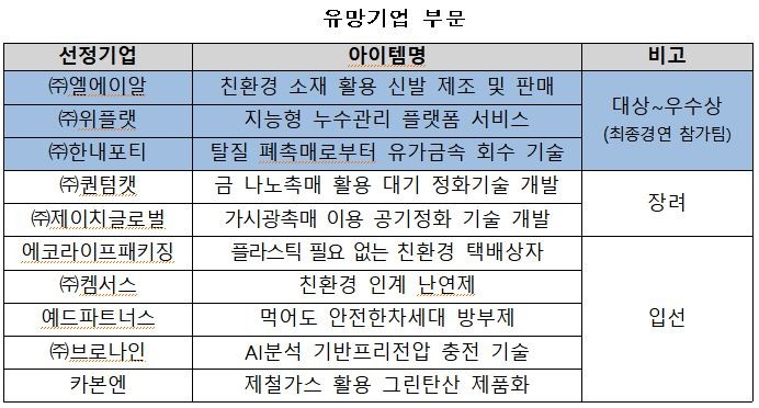 아이디어 부문 3개팀의 창업 아이템은 전기분해를 통한 이산화탄소 자원화 기술, 하·폐수의 인(P)을 활용한 비료 제조, 하수슬러지 건조물의 자원화 기술이다. 유망(스타)기업 부문 3개팀은 탈질 폐촉매의 유가금속 회수 기술, 지능형 누수관리 플랫폼, 친환경 소재를 활용한 신발 제조 사업으로 최종 순위를 겨뤘다.