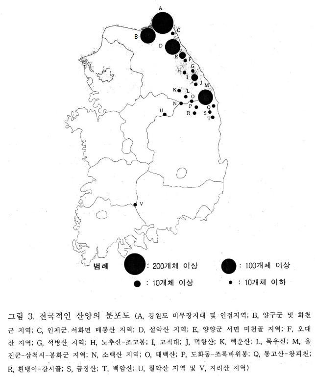 또, 2013년 야생동물연합과 원주지방환경청은 삼척시 가곡면 일대에서 강릉‧태백 지역 학생, 삼척국유림관리소, 산양보호협회 회원과 함께 산양 먹이주기 연중행사를 실시해왔다. 원주지방환경청은 삼척 국도 38호선 주변 산에서 7마리 확인, 2009년에도 인근서 13마리 발견됐다고 정식 보고하기도 했다.