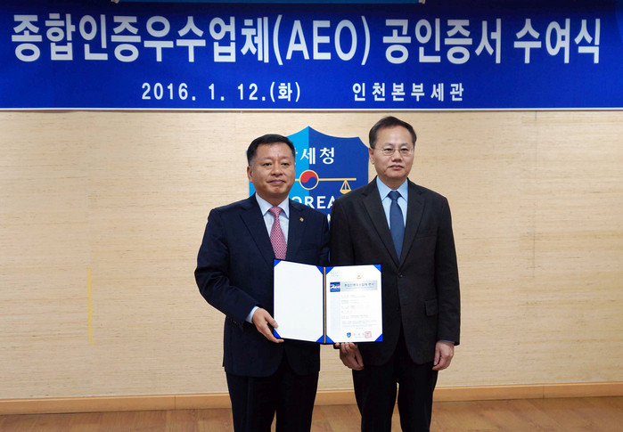 지난 12일 인천본부세관에서 열린 2015년 제 4회 종합인증우수업체 공인증서 수여식에 쌍용자동차 구매1담당 박경원 상무가 참석해 차두삼 인천본부세관장으로부터 수출입 부문 AEO 공인증서를 수여받았다.