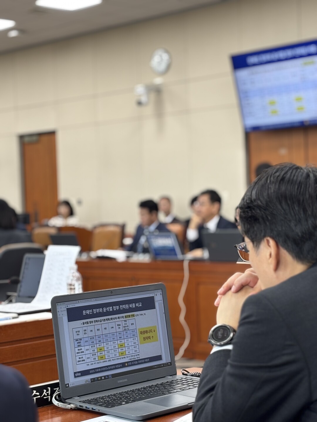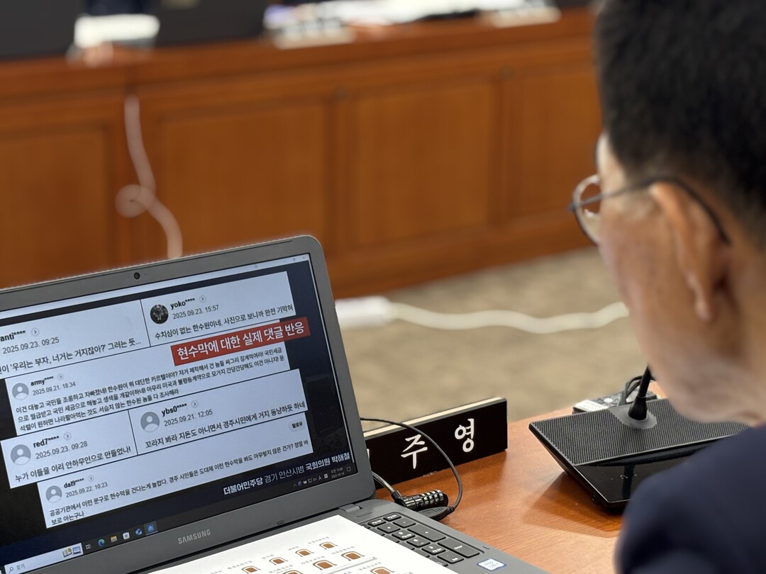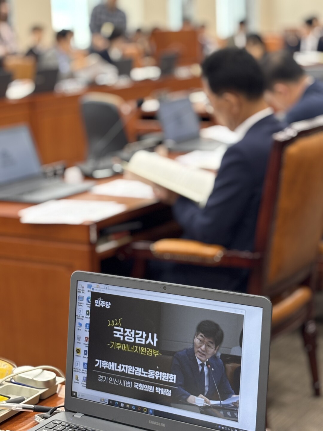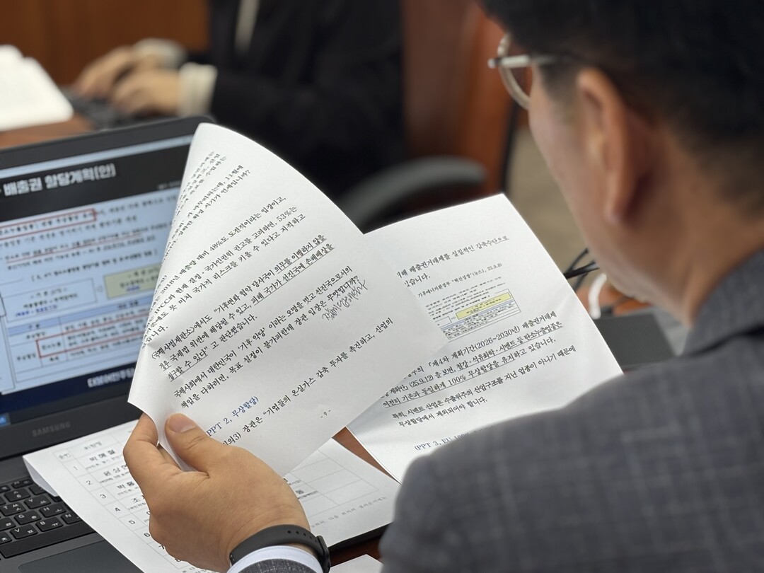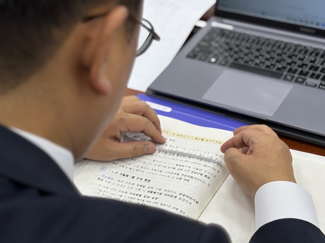 기후에너지환경부 김성환 장관(사진 중앙)이 질의에 간결하게 답변에 시선을 끌었다. 바로 옆은 산업통상자원부에서 자리를 옮겨온 이호현 제2차관이 경청하고 있다.더불어민주당 김태선 의원이 환경부 업무보고 자료집 내용중 오류가 있는 부분에 붙어 있는 종이를 떼어보고 있다.김주영 의원 기후에너지환경노동위원회 간사가 최근 경주시에 내건 한수원 현수막 사건과 내부 비리 최악의 사태에 대한 시민들의 원성을 글들을 보고 있다. 김성환 장관은 철저한 조사에 대해 대책을 종합감사까지 제출하겠다고 밝혔다.