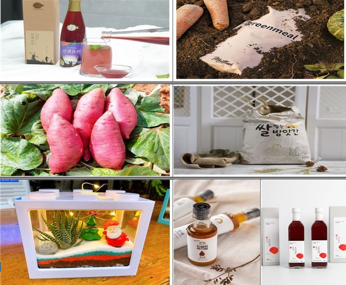 청년창업농은 내놓은 농산물은 선셋유자, 반려견 사료, 고구마, 쌀, 체험화분키트, 참기름, 오미자청이다.