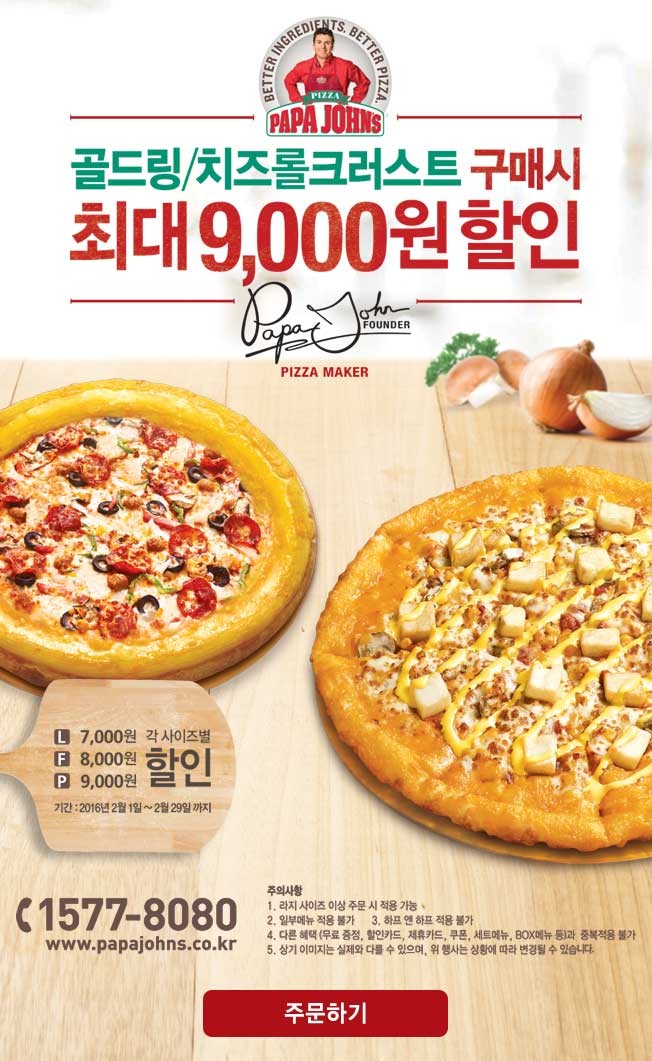 파파존스의 할인은 다양한 도우 타입 중 골드링크러스트와 치즈롤크러스트 주문 시 제공되며, 라지사이즈 이상부터 적용된다.