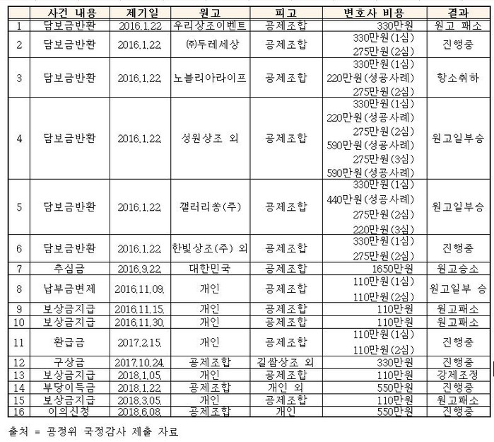 한국상조공제조합은 2016년 1월 상조업체 ㈜두레세상 등 6곳이 담보금 반환 청구소송을 각각 제기하자 6건의 법률대리를 모두 공정에 맡겼다.