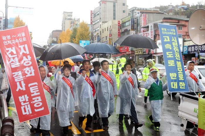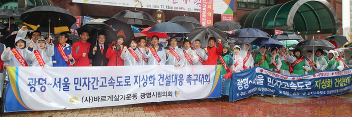 광명~서울민자고속도로건설반대범시민대책위원회는 13일 광명시민회관 앞에서 시민과 지역정치인 등 500여명이 참석한 가운데 광명~서울간 민자고속도로 지상화 건설에 반대하는 촉구대회를 가진 뒤 거리 캠페인을 실시했다.