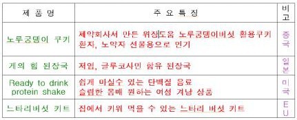 조사 결과 노루궁뎅이버섯 쿠키, 글루코사민 함유 된장국, 한손으로 뿌려 사용할 수 있는 밀가루, 고당도 과일토마토, 저염간장, 김·깨가루 첨가 팝콘, 단백질 음료, 유산균 초콜릿 등 '웰빙·간편·퓨전'이라는 전세계 농수산식품분야에서 주목받고 있는 공통 키워드를 반영한 상품과 요구르트맛 천연수, 느타리버섯 키트 등 다양한 아이디어 상품이 해외에서 인기를 끌고 있는 것으로 나타났다