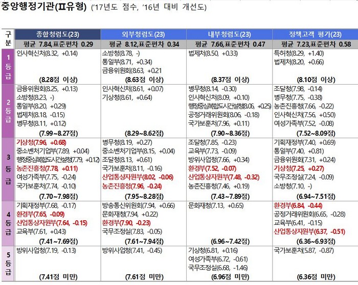 ▲국민권익위원회는 2017년도 중앙정부기관에 대한 청렴도 등을 발표한 자료에는 환경부를 비롯 산하기관이 3등급, 4등급에 추락 하는 것으로 나타났다. |