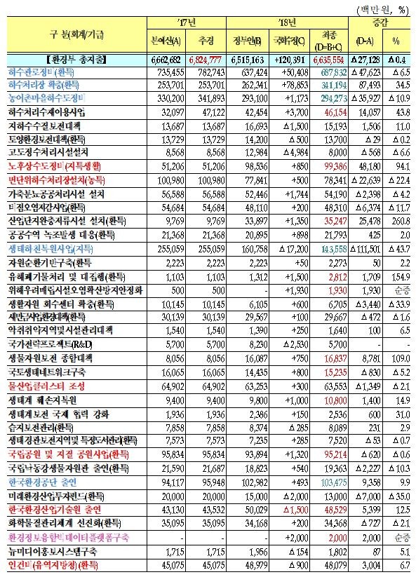 눈길을 끄는 총지출 항목 하수처리수재이용사업, 지하수수질보전대책, 산업단지완충저류시설 설치, 위해우려매립시설오염확산방지안정화, 생태계 훼손지복원, 유해폐기물처리 및 대집행에 평균 15% 증액됐다.