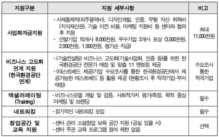 참여기업은 사업비를 지원받음과 동시에 한국환경공단 직원과 함께하는 기술 컨설팅 멘토링 및 테스트베드 지원 인천사회적경제적지원 센터를 통한 경영 컨설팅 창업공간 및 농협은행의 금융컨설팅 등 창업지원 프로그램을 통해 실질적인 성장을 도모할 수 있다.
