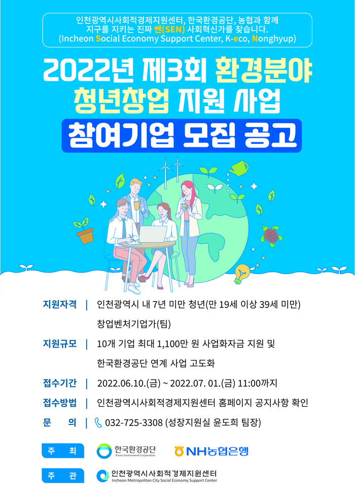 이를 위해 실행 가능한 환경 일자리를 만들기 위해 한국환경공단은 농협은행 인천영업본부, 인천시사회적경제지원센터와 함께 2022년 환경분야 청년창업 지원 사업 참여기업을 7월 1일까지 모집 한다.