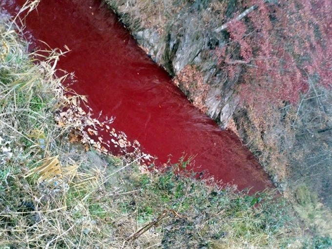 ▲최근 경기도 연천군 임진강 상류의 한 하천이 인근 살처분 돼지 사체에서 새어 나온 핏물로 오염돼 비과학적인 살처분 시스템이라 는 것이 또 한번 드러났다. 제공=연천임진강시민네트워크 |