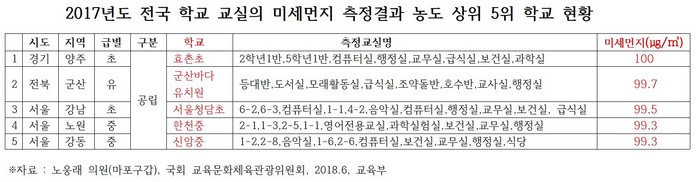 이 밖에도 행정도시인 세종시 소재 공립 '글벗중학교'도 같은 농도인 99.3(㎍/㎥)를 기록했다.