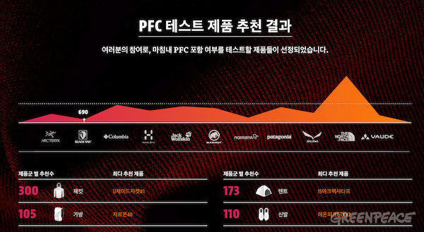 온라인을 통해 시민들의 추천을 받아 PFC 포함 여부를 테스트할 브랜드와 제품들, 한국 브랜드에서는 유일하게 블랙야크가 포함되어 있습니다.
