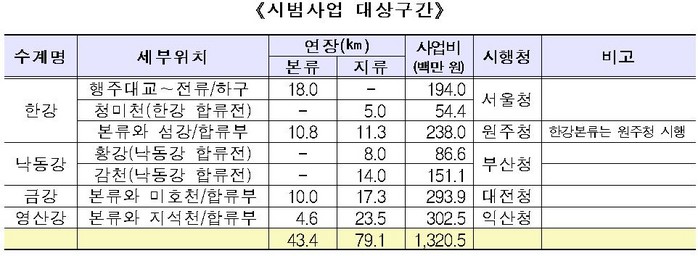 이번 조사 기간은 연말부터 내년 3월까지다. 시범사업은 5개 지방 국토관리청별로 한강을 비롯 낙동강,금강, 영산강의 본류 및 지류 7개 구간(122.5km)를 대상으로 실시한다.