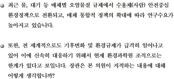 ▲21대 국회환노위 국정감사에서 노웅래 의원은 국립환경과학원을 상대로 통합허가제도 시스템 등을 질의했다. |